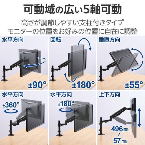可動域の広い5軸可動のロングアームタイプで、高さが調節しやすい支柱付きです。
