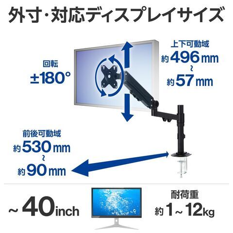 ◆ロングアームのメカニカルスプリング式シングルモニターアーム。! 40インチまでのモニターに対応