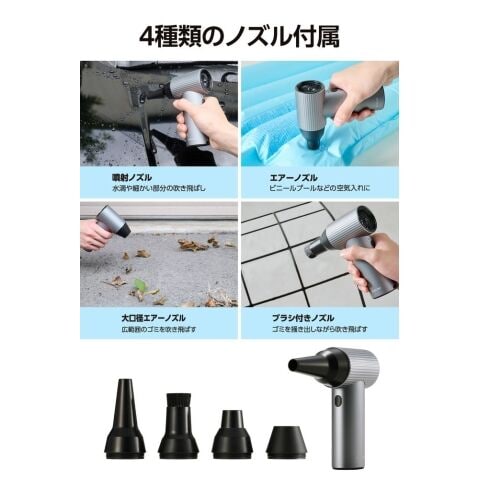 ※使用環境によって変化します。 - 内容物:電動エアダスター本体、噴射ノズル、ブラシ付きノズル、エアーノズル、大口径エアーノズル、USB-A - USB Type-C(TM)ケーブル