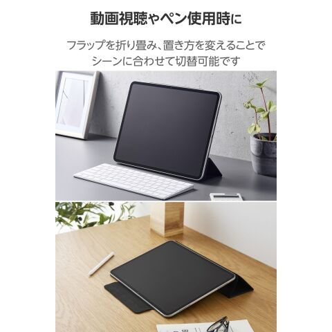 ◆端末本体に内蔵されたマグネットを利用して、簡単に着脱できる超薄型・軽量設計のフラップケースです。動画視聴やタイピング等のシーンに合わせて2アングルにできます。