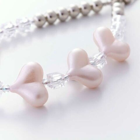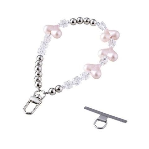 ピンクのハートモチーフが愛らしさを引き立てる、キュートなビーズハンドストラップです。