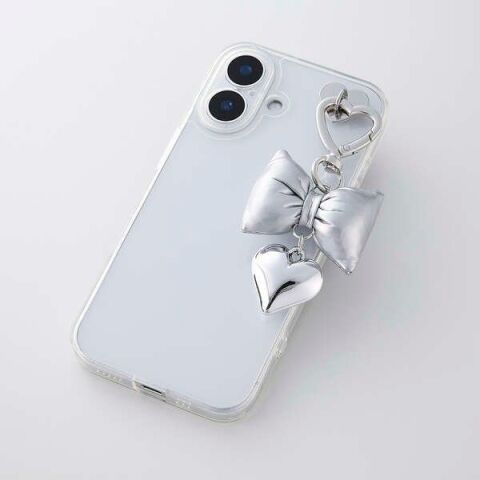 エレコム スマホチャーム リボン 強力粘着 ハート型チャームホルダー付 落下防止 スマホケース用(シルバー) P-STKHBERSV 【返品種別A】