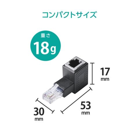 機器への接続時、上向きにケーブルを出すことができる、RJ45 L字変換コネクターです。