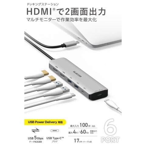 エレコム USB-C ドッキングステーション 85W PD充電 4K HDMI ×2 最大3画面 高速転送 ハブ 6in1 USB 3.2 MacBook/iPad/Windows等対応(シルバー) DST-M060BPSV 【返品種別A】