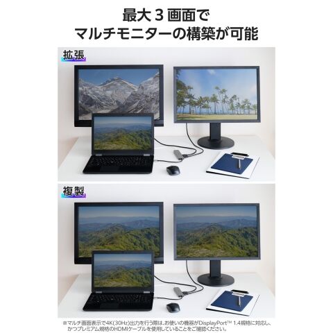 マルチ画面表示(Windows OS)に対応し、最大4K/30Hzの出力が可能です。HDMIポートを2つ同時に使用することで、2画面への同時出力ができ、最大3画面でコンテンツを楽しめます。