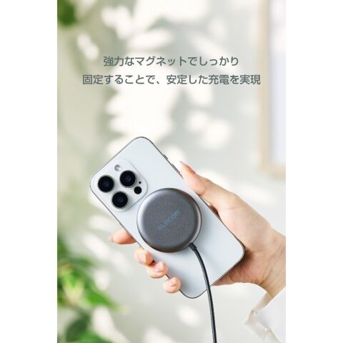 マグネットで対応するスマートフォンに固定するだけで高速充電できる、Qi2 25W規格対応のワイヤレス充電器です。