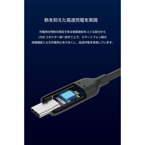 異物検知機能を搭載。スマートフォンと充電器の間にコインなどの金属異物がある場合は充電を停止し、異常発熱のリスクを軽減します。