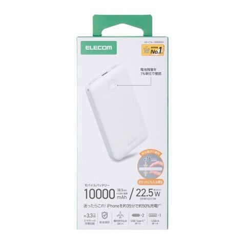 エレコム モバイルバッテリー 10000mAh 小型 軽量 22.5W充電 3ポート(Type-C×2/USB-A) 液晶残量表示 PSE適合(ホワイト) iPhone/Android/Switch対応 旅行 防災 DE-C76-10000WH 【返品種別A】