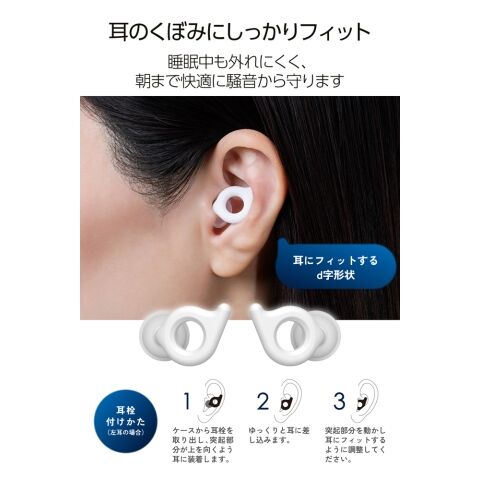 耳甲介にもフィットするd字形状が耳穴に密着して、睡眠時も外れにくく、紛失を防ぎます。