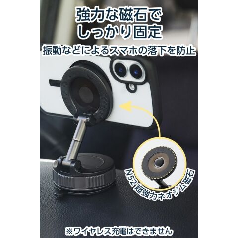 MagSafe対応のスマートフォンやケースを使用することでホルダーに固定でき、運転中の振動や急ブレーキなどによるスマートフォンの落下を防ぎます。
