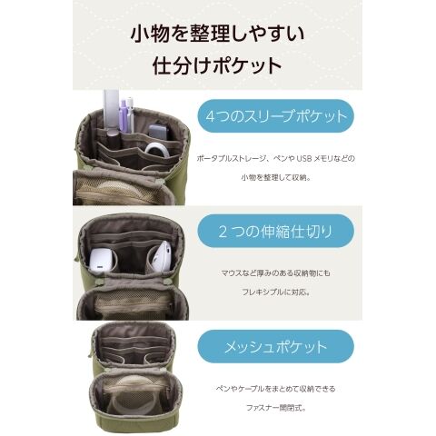 ポータブルストレージ、ぺンやUSBメモリなどの小物を整理して収納できる4つのスリーブポケットを備えています。