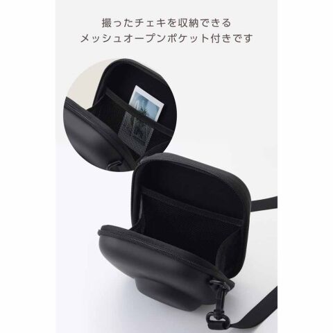 撮ったチェキを収納できる、メッシュオープンポケットが付いています。