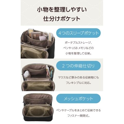 ポータブルストレージ、ぺンやUSBメモリなどの小物を整理して収納できる4つのスリーブポケットを備えています。