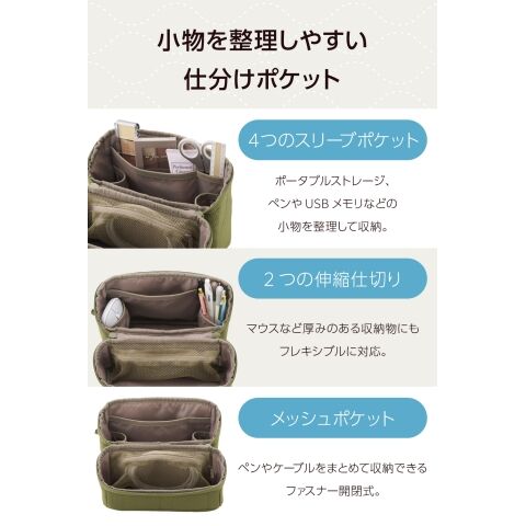 ポータブルストレージ、ぺンやUSBメモリなどの小物を整理して収納できる4つのスリーブポケットを備えています。