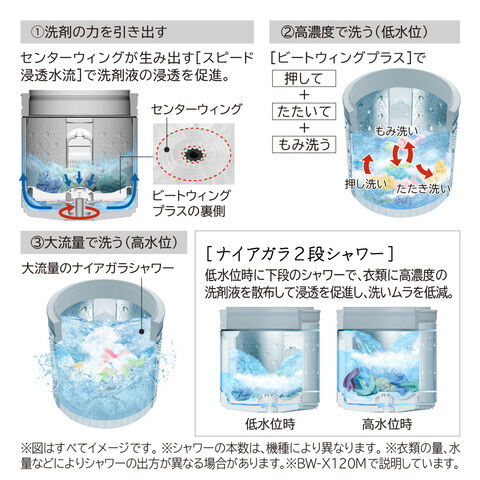 高濃度の洗剤液を衣類にすばやく浸透させ、[押し洗い][たたき洗い][もみ洗い]と大流量の[ナイアガラシャワー]で洗浄することで、しつこい汚れもすっきり洗い上げます。