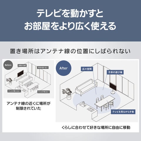 チューナーとモニターが別体なので、アンテナ線のある場所に縛られず、コンセントのある場所ならキャスター付きのモニターを移動して楽しめます。