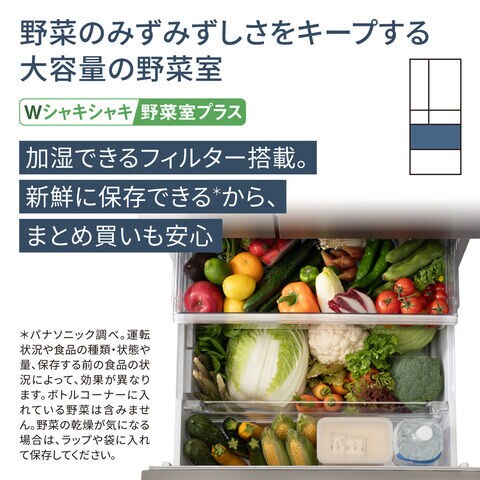 パナソニック調べ。運転状況や食品の種類・状態や量、保存する前の食品の状況によって、効果が異なります。ボトルコーナーに入れている野菜は含みません。野菜の乾燥が気にある場合は、ラップや袋に入れて保存してください。