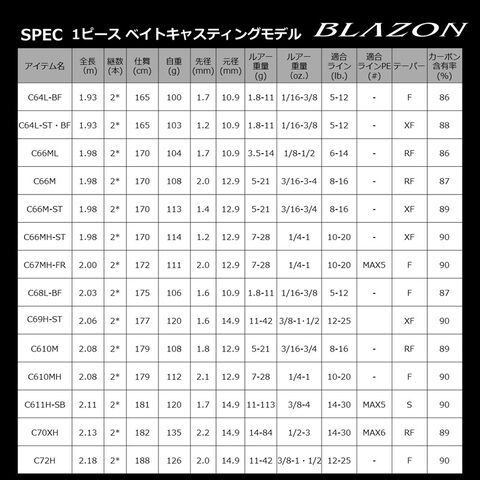 ベイトとスピニングの表記法を変更。「ベイト:C、スピニング:S」とし、2PCロッドは長さの後ろに「-2」