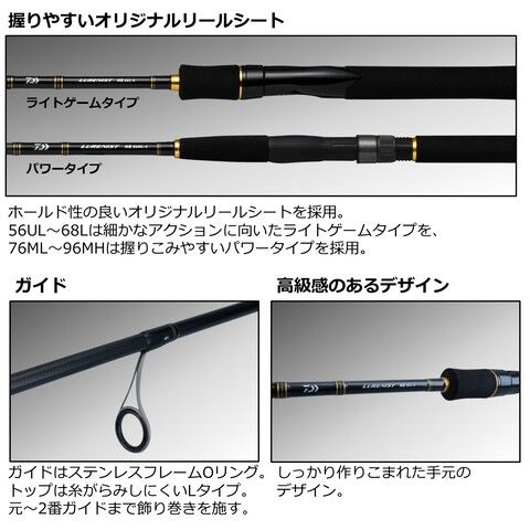 56UL~68Lは細かなアクションに向いたライトゲームタイプを、76ML~96MHは握りこみやすいパワータイプを採用。
