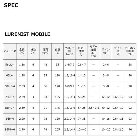 ルアーフィッシングエントリーロッドのLURENISTの性能を落とすことなく、携帯性のよい4ピース仕様にしたモバイルモデル。