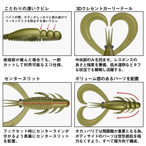 また、当社独自のテクノロジー「アミノX」とエビ粉をボディ素材に配合。集魚成分もフッキングに持ち込む強いバイトを引き出すための重要な役割を果たしている。