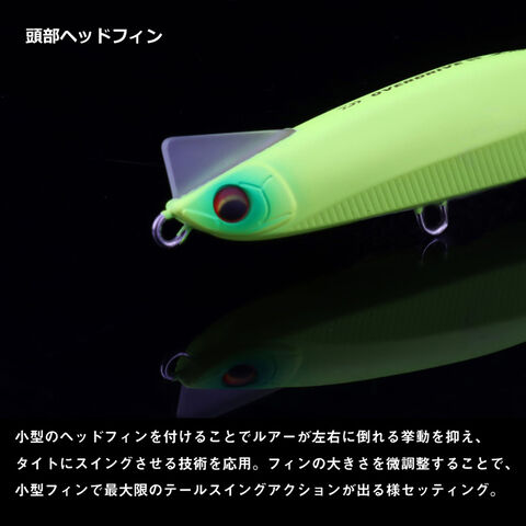 シーバスルアーのモアザン「エスラッシュ」、「ファシャッド」で培った小型ヘッドフィンのノウハウを活用し、スローリトリーブでもワイドテールスイングアクションが出る様セッティング。