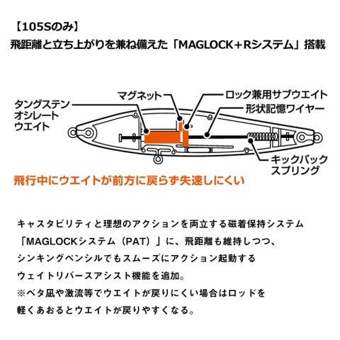 特に105Sは幅の広いS字スラロームアクションを実現。ただ飛ぶだけのジグミノーとは一線を画した「釣るための」シンペン。