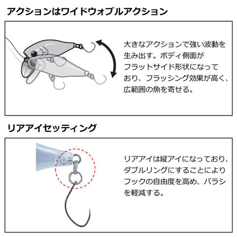 ボディ側面がフラットサイド形状になっており、フラッシング効果が高く、広範囲の魚を寄せる。