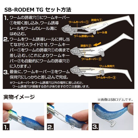 ワームをジグヘッドの誘導レールに乗せて、そのまま誘導穴にキーパーを押し込み、最後に抜け防止ツメを尻の誘導穴にセットするだけで簡単装着が可能!