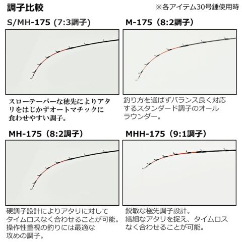 S/MH7:3調子:スローテーパーな穂先によりアタリをはじかずオートマチックに食わせやすい調子。ゼロテン時等の目感度にも優れています。