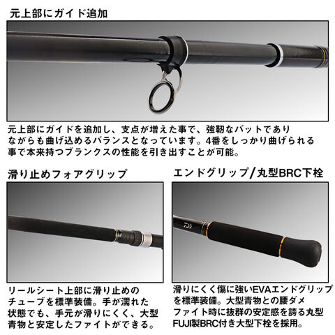 滑りにくく傷に強いEVAエンドグリップを標準装備。大型青物との腰ダメファイト時に抜群の安定感を誇る丸型FUJI製BRC付き大型下栓を採用。
