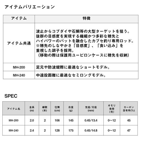 波止からコブダイや石鯛等の大型ターゲットを狙う。抜群の目感度を実現する繊細かつ多彩な穂先とハイパワーのバットを融合したかぶせ釣り専用ロッド。