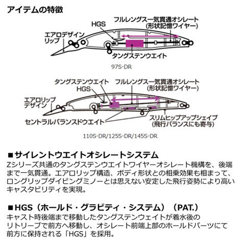キャスト時後端まで移動したタングステンウェイトが着水後のリトリーブで前方へ移動し、オシレート前端上部のホールドパーツにて前方に 保持される「HGS」を採用。