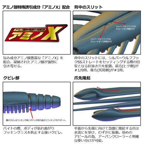 また、当社独自のテクノロジー「アミノX」とエビ粉をボディ素材に配合。集魚成分もフッキングに持ち込む強いバイトを引き出すための重要な役割を果たしている。