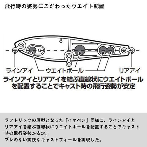 ラインアイとリアアイを結ぶ直線状にウエイトボールを配置することでキャスト時の飛行姿勢が安定し、ブレのない爽快なキャストフィールを実現した。