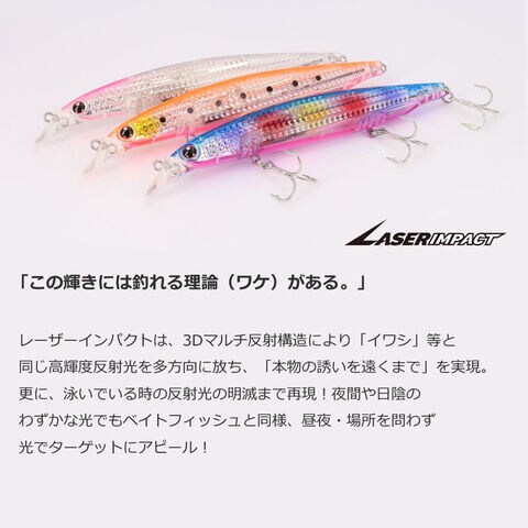 レーザーインパクトは、3Dマルチ反射構造により「イワシ」等と同じ高輝度反射光を多方向に放ち、「本物の誘いを遠くまで」を実現。