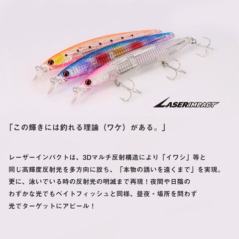 レーザーインパクトは、3Dマルチ反射構造により「イワシ」等と同じ高輝度反射光を多方向に放ち、「本物の誘いを遠くまで」を実現。