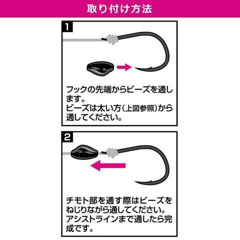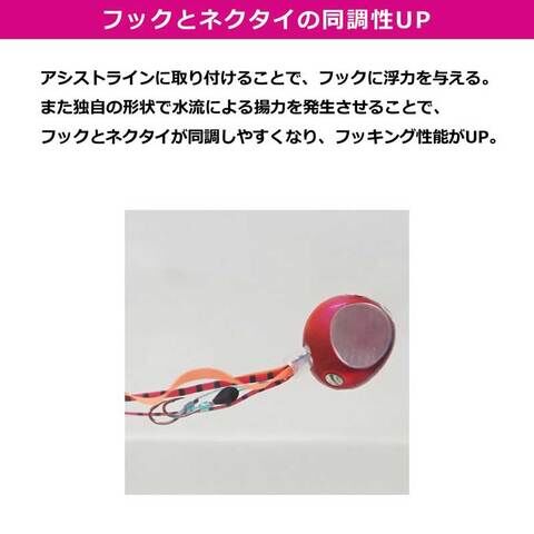 浮力性のある独自形状のビーズをアシストラインに取り付けることで、ビーズが潮を受けフックとネクタイが同調しやすくなり、フッキング性が向上。