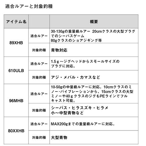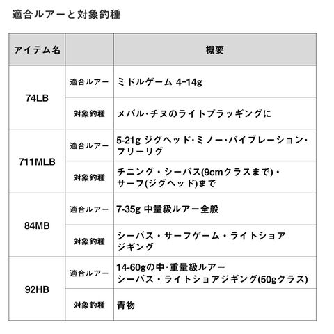74LB/711MLB/610ULB/80XXHBは、シャープに振り抜ける並継仕様、84MB/92HB/89XHB/96MHBは、しっかりルアーがバットまで乗せられる逆並継設計仕様。
