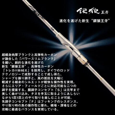 超細身肉厚ブランクと高弾性カーボンが融合した「パワースリムブランク」を纏い、劇的な進化を遂げた新生“銀狼王牙”。
