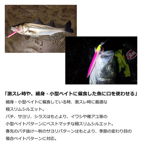 細身・小型ベイトに偏食している時、激スレ時に最適。バチ、サヨリ、シラスはもとより、イワシや稚アユ等の小型ベイトパターンにベストマッチな極スリムシルエット。