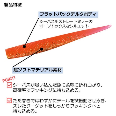 フラットバックデルタボディの、シーバス用ストレートミノーのオーソドックスな形を持つこのワーム。