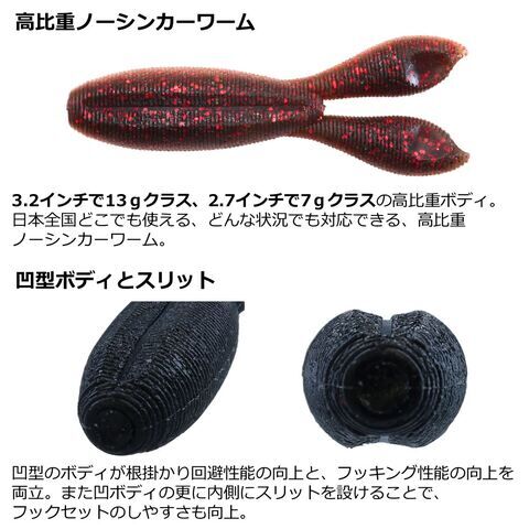 Mクラスの基本タックルで扱える13gクラスの自重に設定し、キャストもしやすく、バックスライドワームとしても使用することができる。