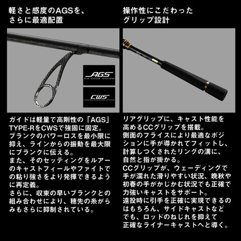 ガイドは軽量で高剛性の「AGS」TYPE-RをCWSで強固に固定。ブランクのパワーロスを最小限に抑え、ラインからの振動を最大限にブランクに伝える。