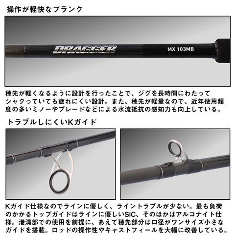 穂先が軽く感じるバランスで設計を行うことで、DRAGGERシリーズの特徴である青物を寄せるための強さと、ロッドを軽快に操作できる快適性を合わせ持つのが特徴。