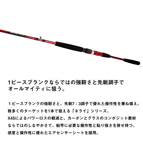 1ピースブランクの強靭さと、先鋭7:3調子で優れた操作性を兼ね備え、数多くのターゲットを1本で狙える「ネライ」シリーズ。