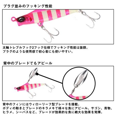 一般的なメタルジグよりも比重が軽い為、プラグのようにスロー~ミディアムリトリーブスピードで使用できる使いやすさを備えながらも、