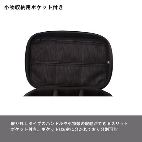 取り外しタイプのハンドルや小物類の収納ができるスリットポケット付きポケットは6室に分かれており分別可能。