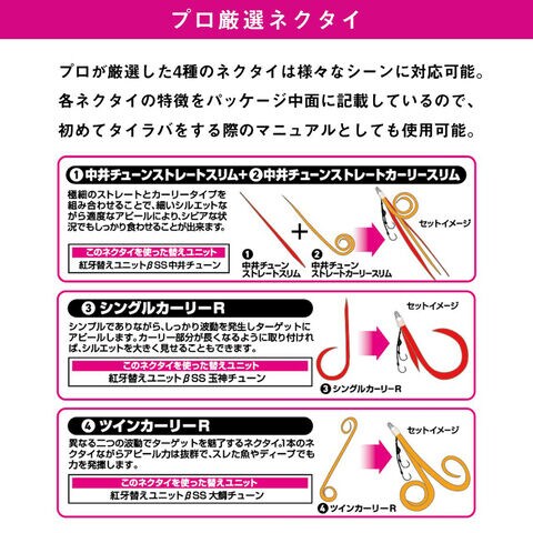 各ネクタイの特徴をパッケージ中面に記載しているので、初めてタイラバをする際のマニュアルとしても使用可能。