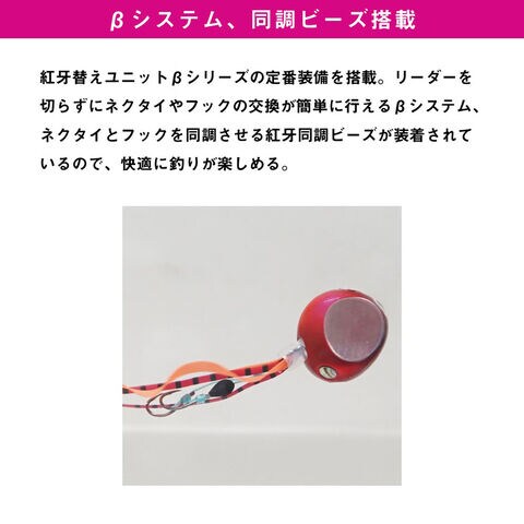 リーダーを切らずにネクタイやフックの交換が簡単に行えるβシステム、ネクタイとフックを同調させる紅牙同調ビーズが装着されているので快適に釣りが楽しめる。